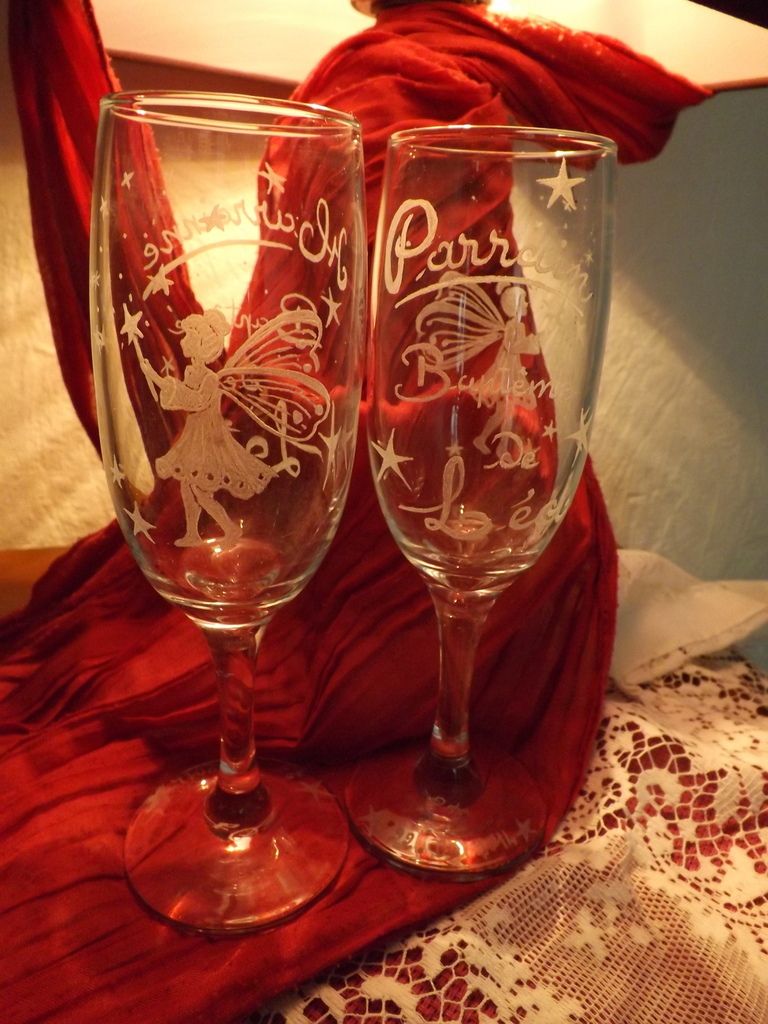 Pour le baptême de Léa , j'ai repris le thème du faire-part pour graver 2 flûtes ,une pour la marraine et une pour le parrain ; le thème étant "la petite fée ".
