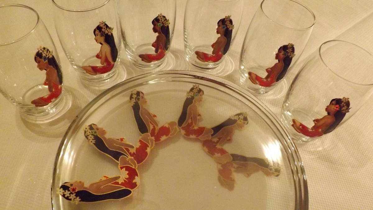 6 assiettes et 6 verres que j'ai dessinés et peints d'une tahitienne . ces articles sont ensuite cuits afin de résister à la vaisselle et au lave-vaisselle à 40 degrés